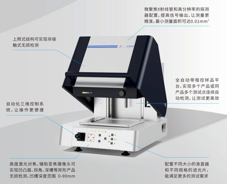 EDXThick800是一款全新上照式多功能自動(dòng)微區(qū)X熒光膜厚測(cè)試儀,既滿足原有微小和復(fù)雜形態(tài)樣品的膜厚檢測(cè)功能,又可滿足有害元素檢測(cè)及輕元素成分分析;搭載自動(dòng)化的X/Y/Z軸的三維系統(tǒng)、雙激光定位和保護(hù)系統(tǒng),可多點(diǎn)位編程測(cè)試,被廣泛應(yīng)用于各類產(chǎn)品的質(zhì)量管控、來(lái)料檢驗(yàn)和對(duì)生產(chǎn)工藝控制的測(cè)量。