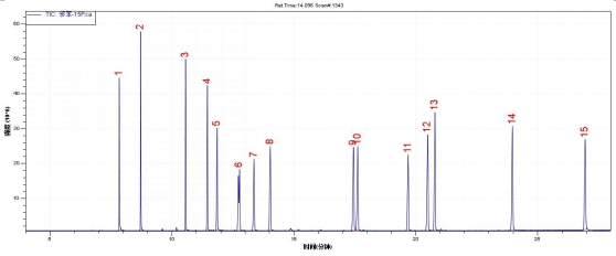 圖1 . 15種鄰苯二甲酸酯標(biāo)準(zhǔn)品TIC圖