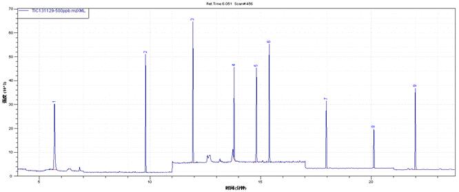 水樣經(jīng)固相萃取柱濃縮、凈化、洗脫后,氮吹定容到一定體積,過(guò)濾后樣品經(jīng)氣相色譜分離后,用質(zhì)譜進(jìn)行檢測(cè)。通過(guò)與待測(cè)目標(biāo)物標(biāo)準(zhǔn)質(zhì)譜圖相比較和保留時(shí)間進(jìn)行定性,外標(biāo)法定量。
