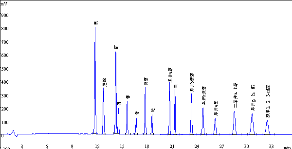 16種多環(huán)芳香烴標(biāo)準(zhǔn)品液相色譜圖如下: