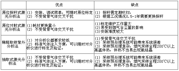 脫硝氨逃逸濃度的量級一般都是幾個ppm,對其準確測量比較困難。目前國內(nèi)外用于煙氣脫硝系統(tǒng)氨逃逸在線監(jiān)測的方法主要有以下幾種,優(yōu)缺點如下: