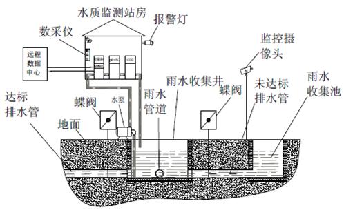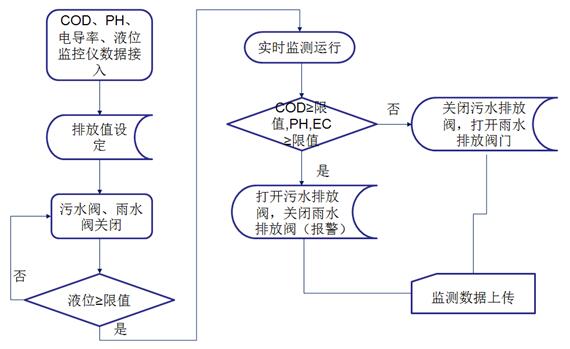 監(jiān)測系統(tǒng)控制采樣單元將水樣導(dǎo)入監(jiān)測室,并啟動監(jiān)測水質(zhì)的COD、pH、電導(dǎo)率等常規(guī)參數(shù)。達標雨水通過電控閥門排入市政雨水管網(wǎng),一旦超標電控閥門關(guān)閉,禁止雨水排入市政雨水管網(wǎng),并通過水泵將超標雨水泵入企業(yè)污水處理系統(tǒng)處理,達標后排放至市政污水管網(wǎng)。同時所有監(jiān)測數(shù)據(jù)經(jīng)由數(shù)據(jù)采集單元將數(shù)據(jù)統(tǒng)計后,由傳輸設(shè)備傳輸至企業(yè)監(jiān)測中心或環(huán)保局,由此完成對雨水排放自動、實時、連續(xù)監(jiān)控。