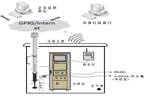 采樣探頭安裝于企業(yè)廢氣排口,排口被測廢氣被負(fù)壓抽泵抽取進(jìn)入采樣探頭探桿(不加熱),經(jīng)過陶瓷濾芯進(jìn)入伴熱管線(伴熱溫度可設(shè)置),樣氣在伴熱管中繼續(xù)傳輸至預(yù)處理系統(tǒng),在預(yù)處理系統(tǒng)經(jīng)過二級過濾和分流后按照一定流量送至在線氣相色譜儀(GC-FID)。在線氣相色譜儀控制內(nèi)置自動取樣平面十通閥和定量環(huán)系統(tǒng)取1mL的被測樣氣,借助載氣送入色譜柱分離和FID做定性、定量分析。分析結(jié)果通過工控機(jī)保存,并和排氣筒監(jiān)測排放參數(shù)一起通過數(shù)采儀送至環(huán)保監(jiān)控平臺。