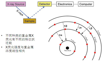 X射線熒光光譜技術(shù)(XRF)的原理見圖3所示,可以直接檢測(cè)固體或液體樣品中ppm量級(jí)的元素成分。采用富集后再檢測(cè)的辦法,使得XRF技術(shù)對(duì)空氣顆粒物中的重金屬成分的檢測(cè)限優(yōu)于0.001ug/m3。而常規(guī)實(shí)驗(yàn)室的檢測(cè)技術(shù),由于預(yù)處理消解過程中需要將微克量級(jí)的樣品溶解到幾十克的液體中,而使得濃度被稀釋百萬倍,從而多數(shù)儀器(譬如ICP-AES、或原子吸收光譜儀)無法檢出元素含量低于10ug/m3量級(jí)的空氣顆粒物樣品。