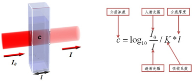 光度比色法主要是根據(jù)朗伯比爾定律,一束單色光照射于一吸收介質(zhì)表面,在通過一定厚度的介質(zhì)后,由于介質(zhì)吸收了一部分光能,透射光的強(qiáng)度就要減弱。吸收介質(zhì)的濃度愈大,介質(zhì)的厚度愈大,則光強(qiáng)度的減弱愈顯著。