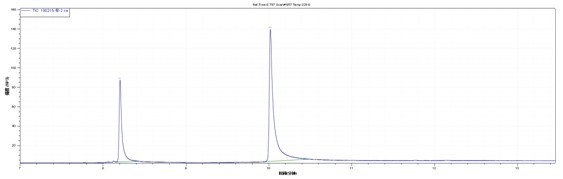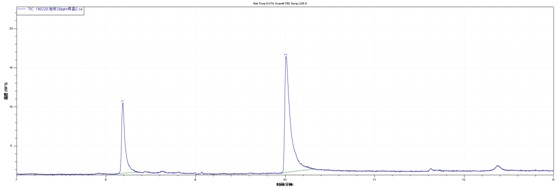 目標(biāo)物在5ppm-100ppm線(xiàn)性良好。取空白食品樣品加標(biāo),樣品經(jīng)過(guò)正己烷和乙酸乙酯(1+1)超聲萃取。20ppm加標(biāo)水平下譜圖如下,得到了比較滿(mǎn)意的效果。